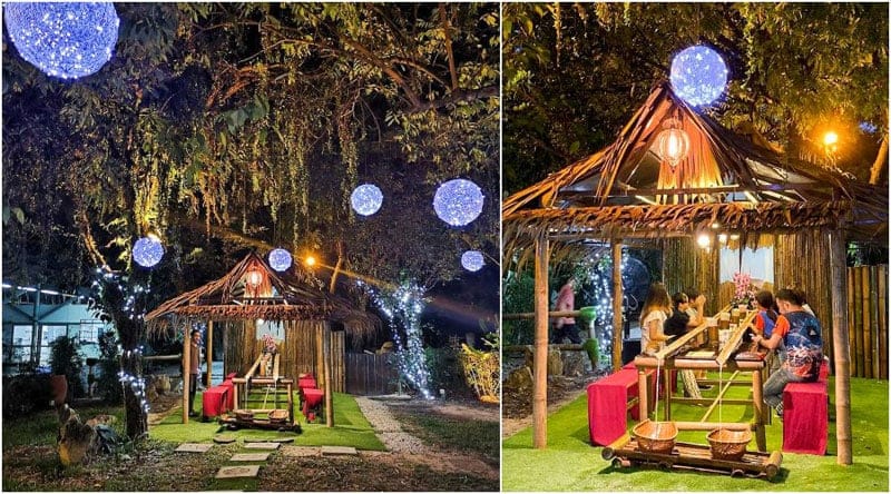 The restaurant sets up their dining areas in bamboo huts over a pond which overlooks the surrounding forest, and when the evening sky rolls in, its charming ambience takes form as the restaurant is lit up by their twinkling lights.
