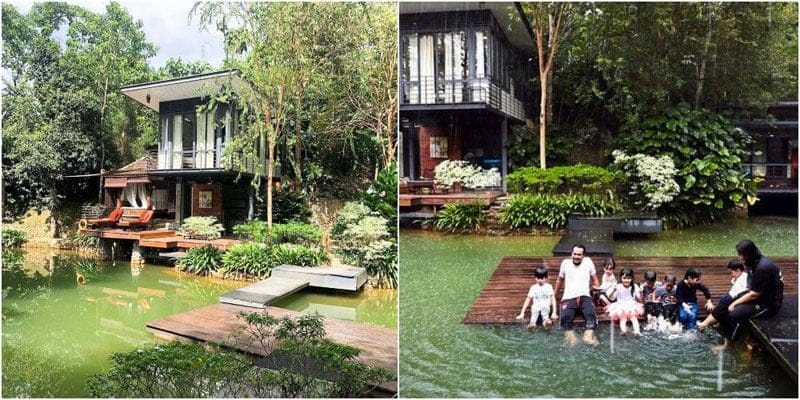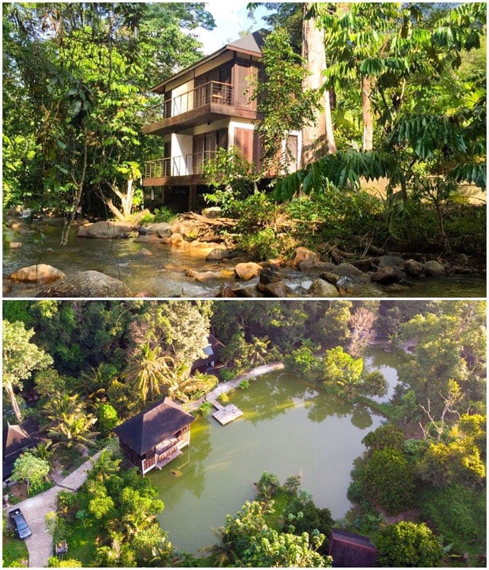 The two retreats are built over a pond and surrounded by tropical fruit trees, with the soothing Sungai Hijau stream flowing in the surroundings.