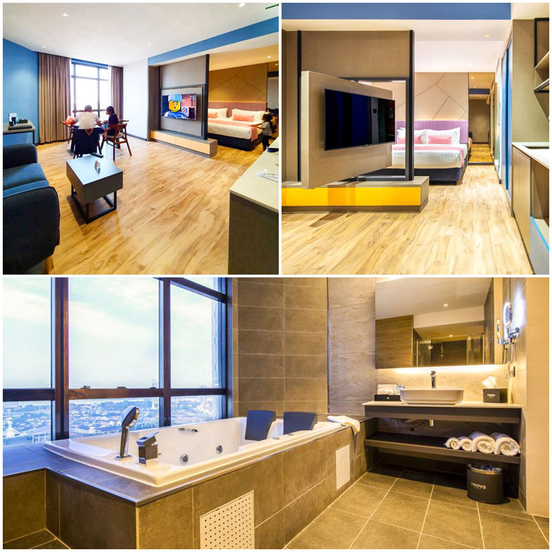 另外,酒店提供的豪华客房Deluxe Room,无论是装潢颜色,还是装饰品都营造出简约大气的氛围!你也可以选择Junior Suite套房,备有独立浴缸,甚至电视机都可以旋转!在床上还是客厅,都能看见电影~