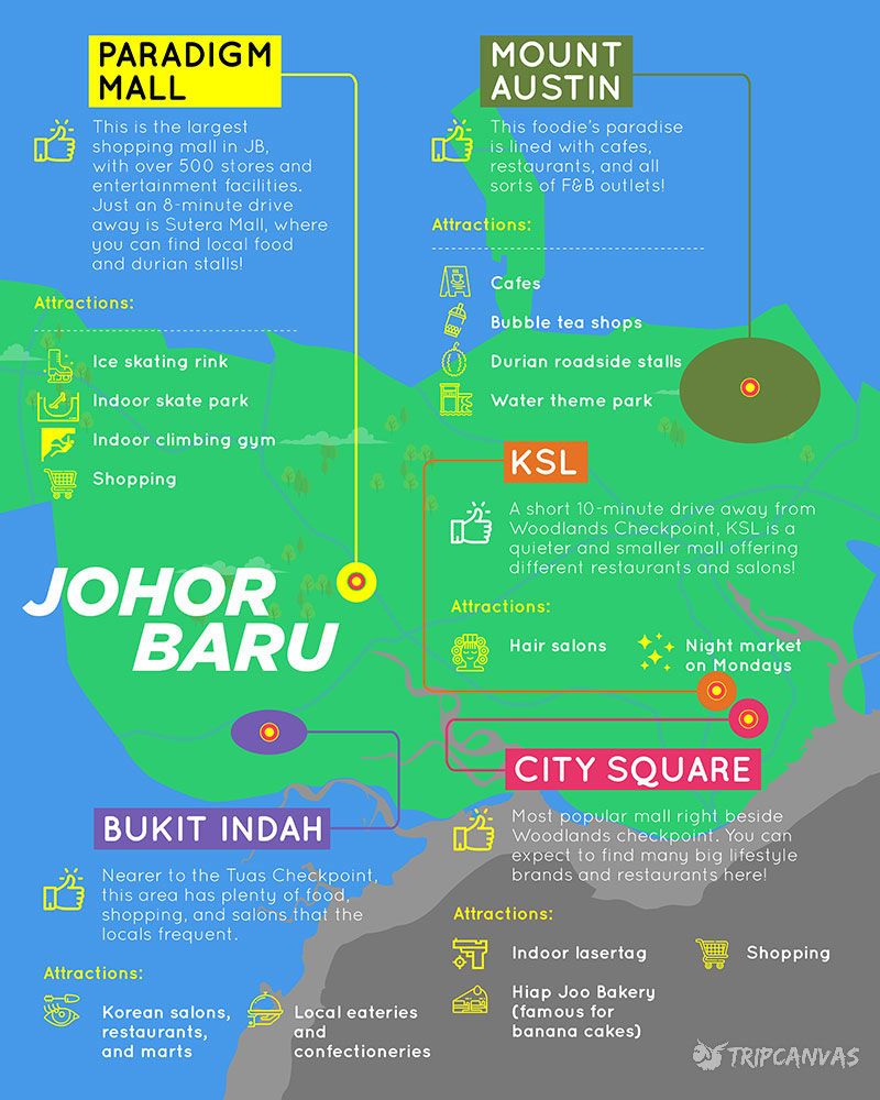 City Square Mall: 位于马新第一通道大马关卡旁边,有天桥相连接,无需担心日晒雨淋,再走过去就是比较崭新的Komtar JBCC购物中心了。对于从新加坡兀兰关卡(Woodlands Checkpoint) 搭公共交通到马来西亚的朋友来说,这里是最方便的购物场所!