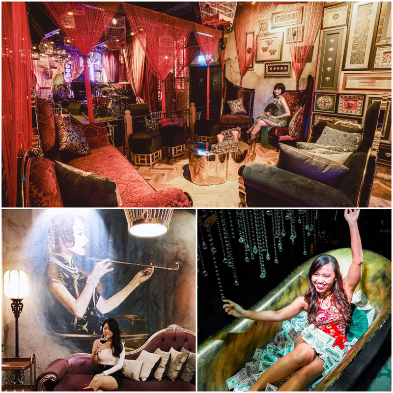 想要进入这家酒吧,当然也是蛮困难的。穿过黑色铁闸,你会找到整墙的百子柜,这就是暗门,至于要如何通过就要考验你的观察能力了~酒吧内部装潢充分展现东方色彩,复古灯笼及牡丹花卉壁画,搭配木桌和藤椅,一直到酒吧核心区,都让人有种身处20年代当铺的感觉。