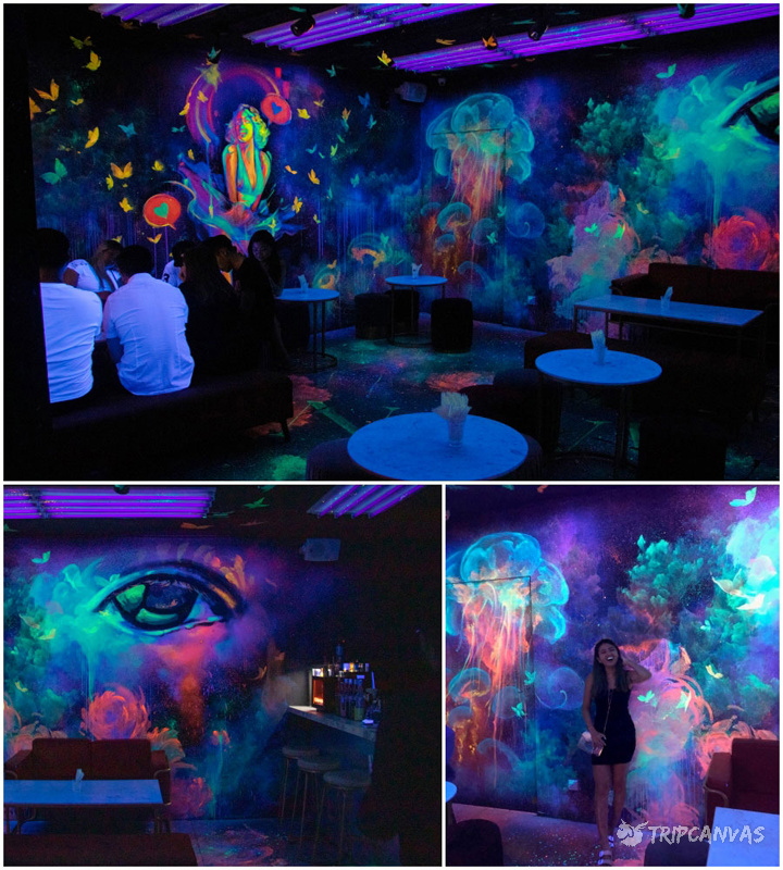 成功进入酒吧,内部到处七彩涂鸦,加上霓虹灯,让你眼花缭乱!无论是墙上的水母、角落的玛丽莲梦露,又或是满地繁星点点,都在黑暗中发光,让人分不清究竟身处现实,还是大型的奇幻世界。(建议穿白色衣服,你也会在黑暗中闪闪发亮~)