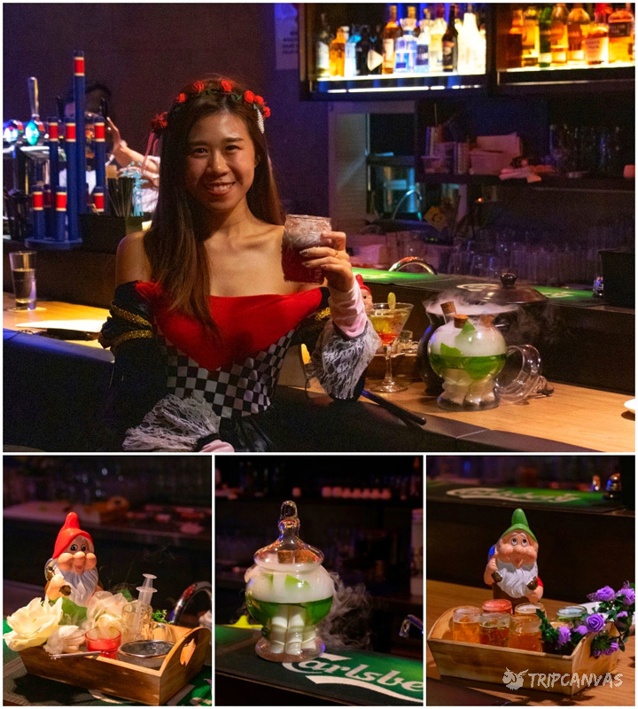 美食,当然也得配美酒。这里的特调鸡尾酒,每一杯都仿佛注入魔法,让人瞬间分不清现实和童话世界。想拯救吃下毒苹果的白雪公主吗?那记得带上Snow White Potion~又或是想见见传说中7位小矮人?七杯彩色beer shot的The Seven Dwarf,能满足你的愿望!