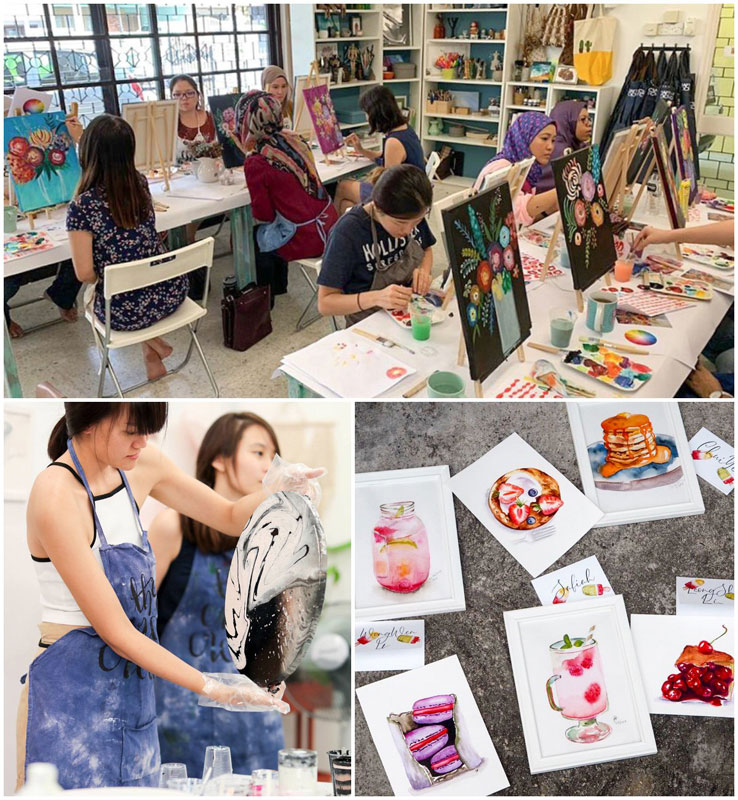 这里主打画画工作坊、现代书法(Calligraphy)、浇画等等。如果你不懂如何作画,也不用担心,这里偶尔提供「浇画」(Pouring Art)课程,你会学习到如何调色和浇画技巧。(随性绘画?太适合随性的小编了~)整个“泼”的过程,看着画慢慢成形,很疗愈~