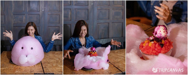 吓死小编了~巨大粉色的海狮—Bubu登场!它竟然比小编的脸大六倍!那究竟该如何下手来品尝这道甜点呢?而且…说好的韩国刨冰在哪里?其实就藏在海狮的身体里,你只需要轻轻撕开海狮(棉花糖),就看到啦~惊不惊喜,意不意外?