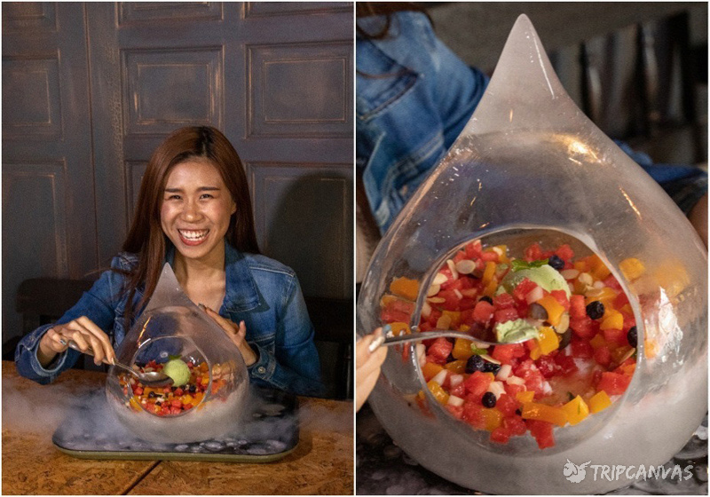这里的经典刨冰也超推荐,而且卖相也超吸睛~这道经典叫Cyrstal,冰如其名,端上桌的就是一座巨大水滴形的冰块容器。这时店员还会倒下干冰,营造出烟气四溢的梦幻画面~对了,刨冰分量很大,可以供四至五个人一起享用~