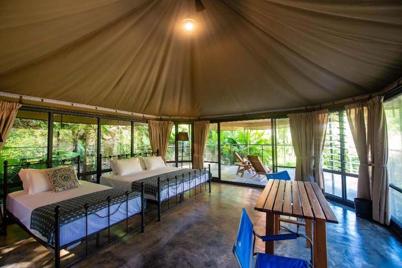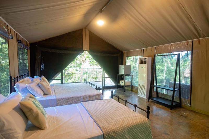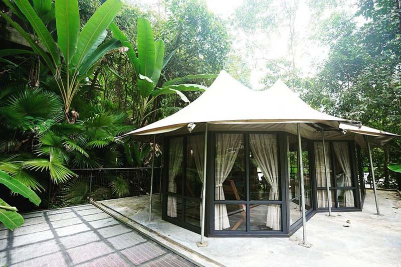这里总共有27种房型,每间都有 超大落地窗 看到外面绿意景色 有些房间还自带观景台,晚上可以 数星星看月亮 房间内也有空调和蚊帐,让整个住宿浪漫又不热~ 夜晚也不怕蚊虫 以防万一可自带防蚊液